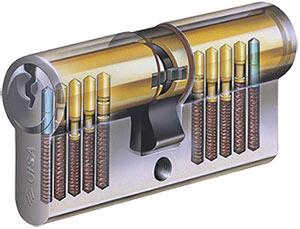 Цилиндар са дворедим тачкастим кључем и 10 пинова од којих је са доње стране први од каљеног челика. Као додатну заштиту од бушења има челичну чивију. Уз цилиндар се добија и код картица.