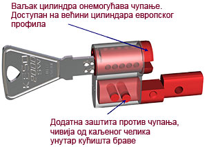 Механизам код цилиндара састоји се од петнаест челичних пинова (са три стране по пет пинова у реду и сви су активни). Може се комбиновати у мастер системима.